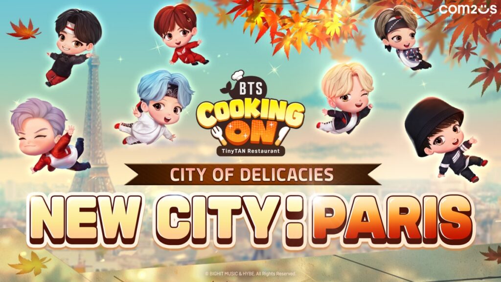 Com2uS (CEO นัมแจกวาน) เปิดตัวอัปเดตใหม่ให้กับเกมทำอาหารสุดน่ารัก ‘BTS Cooking On: TinyTAN Restaurant‘ โดยนำผู้เล่นตะลุยเมืองปารีส เมืองแห่งอาหารอันเลิศรส พบกับสถานที่ชื่อดังอย่างหอไอเฟลและประตูชัยฝรั่งเศส พร้อมกับร้านอาหารใหม่ถึงสามแห่ง รวมถึงกิจกรรมพิเศษที่จะให้ผู้เล่นได้ลุ้นรางวัลมากมาย