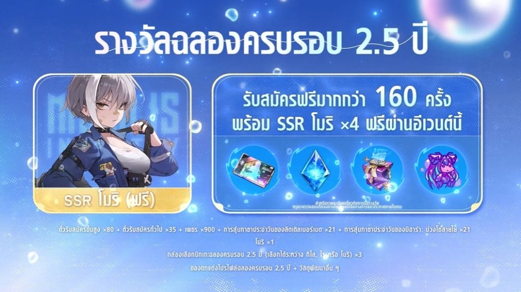 มหกรรมแจกกาชาฟรี 160+ ครั้ง ตลอดช่วงอีเวนต์ฉลอง 2.5 ปีนี้ ผู้เล่นจะได้รับทั้ง ตั๋วรับสมัครขั้นสูง 80 ใบ, ตั๋วรับสมัครทั่วไป 35 ใบ, เพชรฟรี 900 เม็ด, สิทธิ์สุ่มกาชาฟรีประจำวัน ของตู้ลิตเติลเมอร์เมดและมิฮาร่า รวมอีก 42 ครั้ง! ยังมี กล่องเลือกนิกเกะ SSR ฉลองครบรอบ 2.5 ปี (เลือกได้ระหว่าง กิล่า, ไร, โมริ) ให้อีก 3 กล่อง