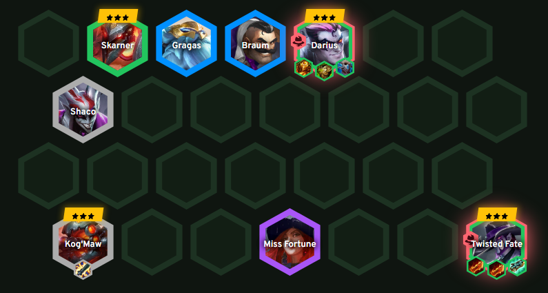 สำหรับ Comp Syndicate เป็นหนึ่งใน Comp ที่เล่นบ่อยมากเพราะเล่นง่าย เพราะสามารถหาเก็บตัวละครได้ตั้งแต่แรกๆ และไป Reroll หนักๆ ตอน Lvl 6 ซึ่งเราจะต้องทำ Twisted Fate และ Darius ให้ได้สามดาว และเป็นไปได้ก็ทำ Skarner ด้วยแต่สำหรับ Kog’Maw ขึ้นอยู่กับว่าจะมีตัวให้สะสมระหว่าง Reroll หาหรือไม่ถ้าไม่ขึ้นก็ไม่ต้องโฟกัสมาก แต่จุดที่ต้องระวังหลักๆ ในการเล่น Comp นี้ก็คือด้านของไอเทมที่ Twisted Fate จะต้องมี 2 Guinsoo’s Rageblade และ Hextech Gunblade ถึงจะสามารถแบกไปช่วงท้ายเกมได้