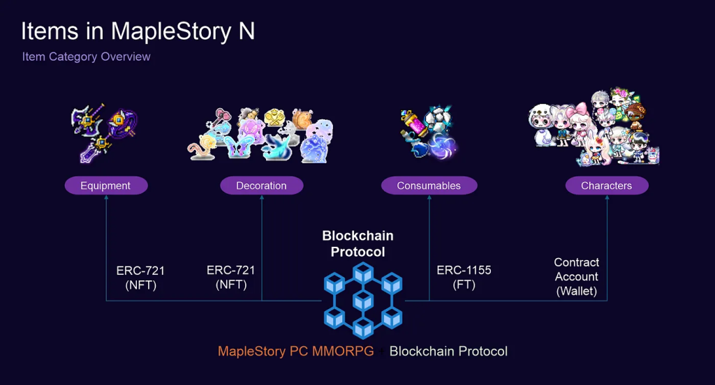 MapleStory N เป็นเกมที่นำจุดเด่นของแฟรนไชส์ MapleStory มาผสานเข้ากับเทคโนโลยีบล็อกเชนและระบบ NFT เพื่อสร้างประสบการณ์ใหม่ที่เน้นเศรษฐกิจดิจิทัลแบบ Play-to-Earn แต่ระบบการเล่นหลักยังคงสไตล์เกม MMORPG ไว้อยู่พร้อมเพิ่มองค์ประกอบทันสมัยที่เปิดโอกาสให้ผู้เล่นสร้างรายได้จากการเล่นเกมผ่าน Maplestory Universe Ecosystem