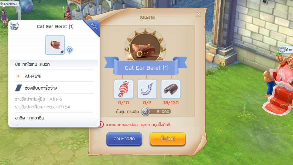 เป็นไอเทมประเภทหมวกที่จัดว่าดีมาก ณ ตอนนี้อย่าง Cat Ear Beret เพราะเป็นไอเทมที่ผู้เล่นสามารถผลิตกันได้กันทุกคน โดยตัวหมวกจะบวกพลังโจมตีคิดเป็นเปอร์เซ็นซึ่งถือว่าดีมากๆ สำหรับช่วงเกมเปิดใหม่ๆ แบบนี้รวมสามารถใส่ในระยะยาวได้เลย แต่เงื่อนไขในการสร้างหมวกนี้ผู้เล่นจะต้องมีเลเวลนักผจญภัยอยู่ที่ คลาส D ที่จะสามารถซื้อแบบภาพของหมวกนี้ได้