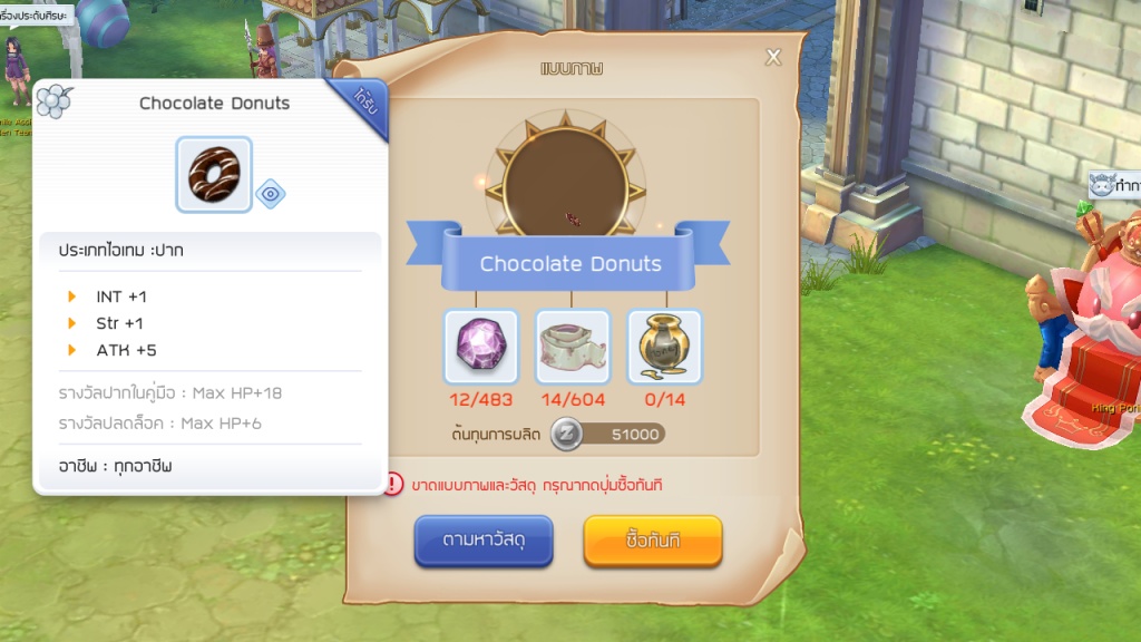 ต่อมา มาถึงส่วนปากบ้างก็คือตัว Chocolate Donuts ที่มีออฟชั่นในการเพิ่มพลังโจมตีทั้ง STR และ INT รวมถึงค่า ATK อีกดังนั้นเหมาะมากสำหรับเกมเมอร์สายฟรีที่ไม่มีอุปกรณ์สวมใส่ประเภทปาก จึงขอแนะนำทำเจ้า โดนัทมาใส่ได้ ซึ่งวัตถุดิบที่ใช้ทำก็จัดว่าหาไม่ยากแต่เน้นไปที่จำนวนมากกว่าแต่เอาจริงๆ ถ้าเรามีตัวละครเลเวลสูงไปฟาร์มหาวัตถุดิบเองก็ใช้เวลาไม่นานเท่าไหร่ก็ครบแล้ว