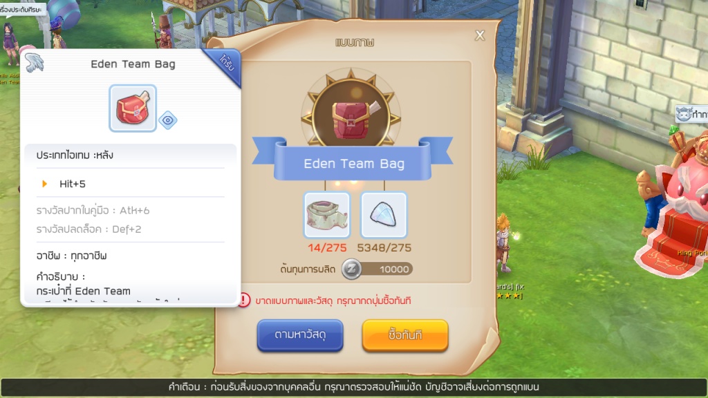 ต่อมาเป็นไอเทมประเภทหลังซึ่งเป็นของต้นเกมที่หลายๆ คนไม่ได้ทำแล้วมองข้ามอีกด้วยก็คือ Eden Team Bag ตัวช่องใส่อุปกรณ์ตรงหลัง โดยผู้ที่เติมตู้กาชาก็จะไม่มีปัญหาอยู่ถ้าได้สมุดมาแต่สำหรับเกมเมอร์ที่สายฟรี ผมแนะนำว่าทำกระเป๋าอันนี้มาเถอะมันจะช่วยเพิ่มค่า Hit รวมวัตถุดิบที่ใช้ก็หาง่ายแสนง่าย แล้วถ้าเรามีไอเทมหลังอันใหม่สามารถนำหมวกอันนี้ไปใส่สมุดภาพเพื่อช่วยเพิ่มดาเมจได้อีกด้วย เป็นของดีราคาประหยัดอีกหนึ่งชิ้น