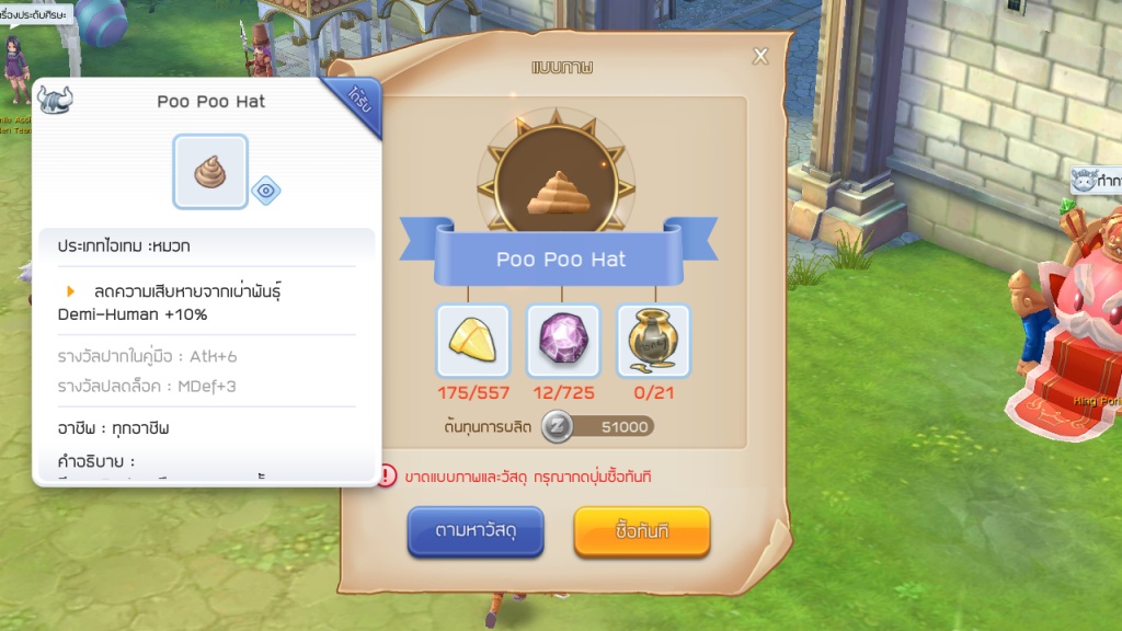 อันสุดท้ายขอแนะนำหมวกสำหรับสาย PVP บ้างโดยเจ้าหมวกขี้ตัวนี้เป็นไอเทมที่นิยมมากสำหรับใช้ PVP หลายๆ คนก็คงทราบกันดีอยู่แล้วเป็นมันฮิตตั้งแต่สมัย Ragnarok Online เพราะตัวความสามารถของมันจะช่วยลดพลังโจมตีจากเผ่ามนุษย์ถึง 10% ดังนั้นพวกชอบต่อสู้กับผู้เล่นอื่นควรมีไว้สักใบเผื่อสลับเปลี่ยนได้ อีกหน่อยมีระบบกิลด์วอก็น่าจะสำคัญไม่น้อยแน่นอน