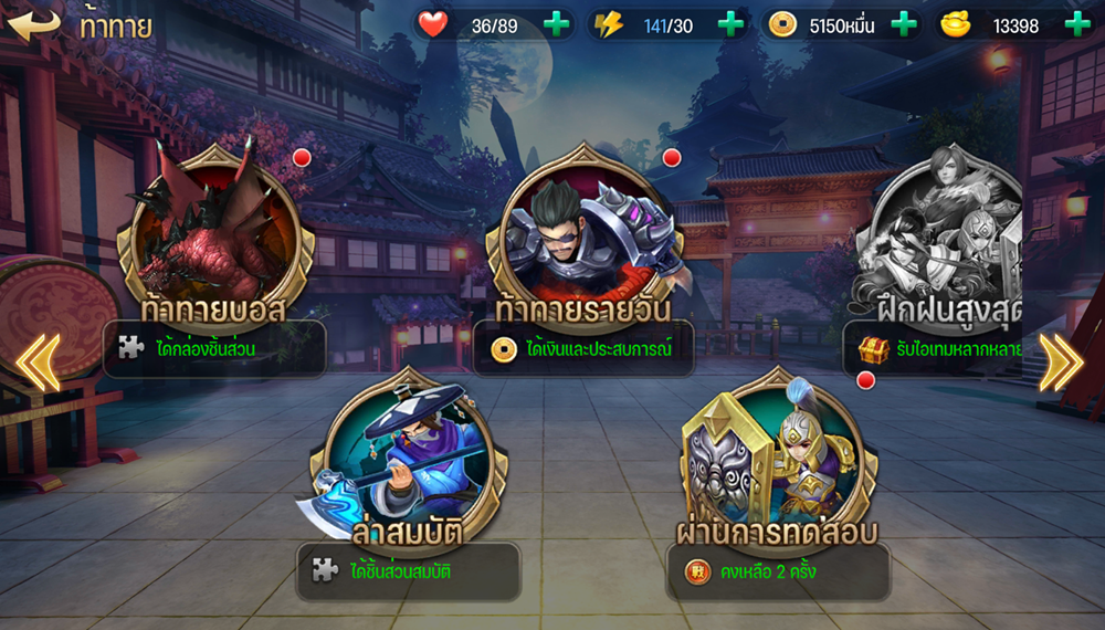 1. โหมดท้าทาย เป็นโหมดที่จะรวบรวมความท้าทายพิเศษนอกเหนือการตะลุยด่านปกติซึ่งในด่านธรรมดาเราจะได้รับไอเทมส่วนหนึ่งในการพัฒนากองทัพ หรือ ตัวละคร แต่หากต้องการยกระดับตัวละครไปอีกขั้น เราต้องมาเลือกเล่นโหมดเหล่านี้เพื่อหาวัตถุดิบในการพัฒนาต่อไป ไม่ว่าจะเป็นชิ้นส่วนอาวุธ ตัวละคร เงิน และอื่นๆ อีกมากมายที่จะเป็นของรางวัลแอบซ่อนในโหมดนี้เหมือนขุมทรัพย์ที่รอคุณมาเอา แต่ก็มีข้อจำกัดในการหา ซึ่งแต่ละอันก็จะมีกฏเป็นของตัวเองดังนั้นลองเข้ามาลองเล่นดูใช้ความเข้าใจไม่ยากแน่นอน อันนี้คอนเฟิร์ม