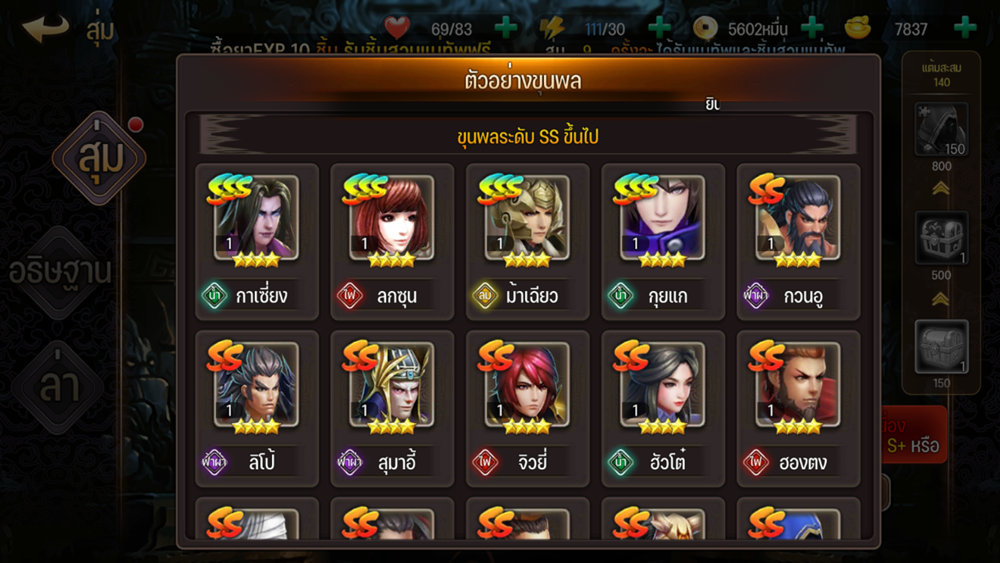 หนึ่งความสำคัญที่ผู้เล่นห้ามมองข้ามเด็ดขาดก็คือ การรวบรวมเหล่าขุนพลเลื่องชื่อจากก๊กต่างๆ ไว้ในทีมเพื่อสร้างและออกแบบทีมสุดแข็งแกร่ง พื้นฐานแล้วการหาก็คงหนีไม่พ้นการเปิดตู้กาชาอย่างแน่นอน แต่ตัวเกมก็มีการมอบบัตรอัญเชิญตัวละครที่มีการแจกจาก ดันเจี้ยน กิจกรรม ภารกิจ การตะลุยด่าน และโหมดการเล่นอื่นๆ อีกจำนวนมากทำให้การรวบรวมตัวละครก็เป็นอะไรที่สายฟรีสามารถหาตัวเทพๆ มาอยู่ได้แน่นอน อาจจะต้องใช้เวลาหน่อย