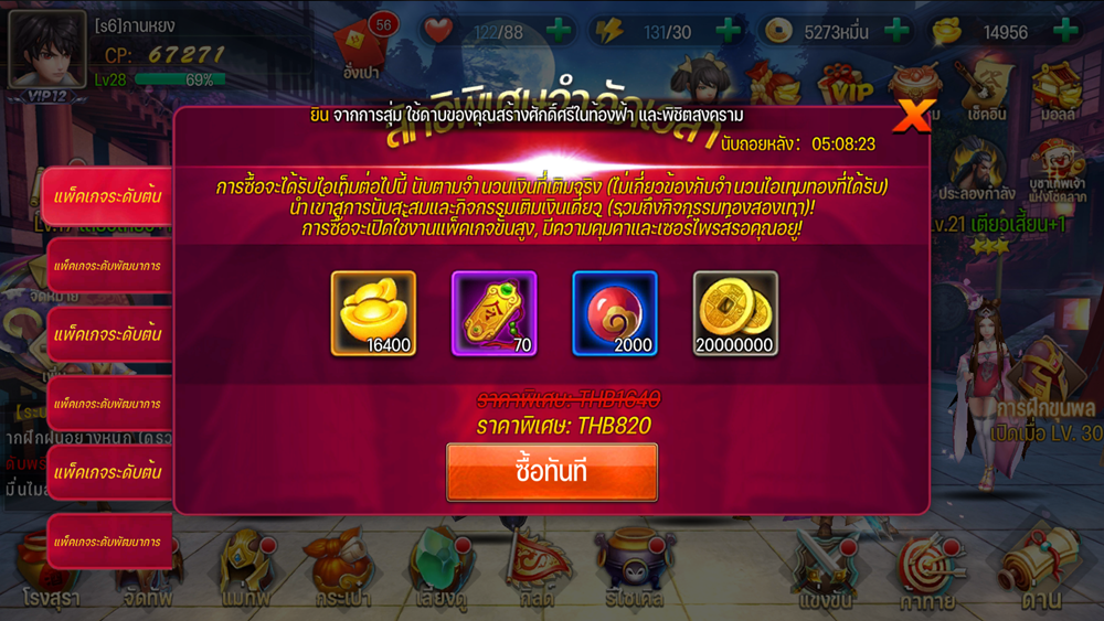 สำหรับเกมเมอร์บางคนที่มีทุนทรัพย์ ตัวเกมก็จะมีแพคเกจเริ่มต้นในราคาสบายกระเป๋าเพื่อให้ใช้ชีวิตงานไม่เป็นผู้ประสบภัยในช่วงแรก ก็มีให้เลือกซื้อเช่นเดียวกัน เพราะภายในแพคก็จะมี ตั๋วอัญเชิญขุนศึก ทอง หรือ เงินที่ทำให้พวกคุณได้มีโอกาสสร้างทีมแข็งแกร่งได้ง่ายกว่าสายฟรีอย่างแน่นอน เพราะคุณจะได้สุ่มตัวละครรวมๆ เป็นร้อยครั้งเลย ในรูปจะเป็นตัวอย่างแพคแรกเท่านั้น แต่เข้าไปดูจริงๆ จะมีให้เลือกหลากหลายแบบมาก